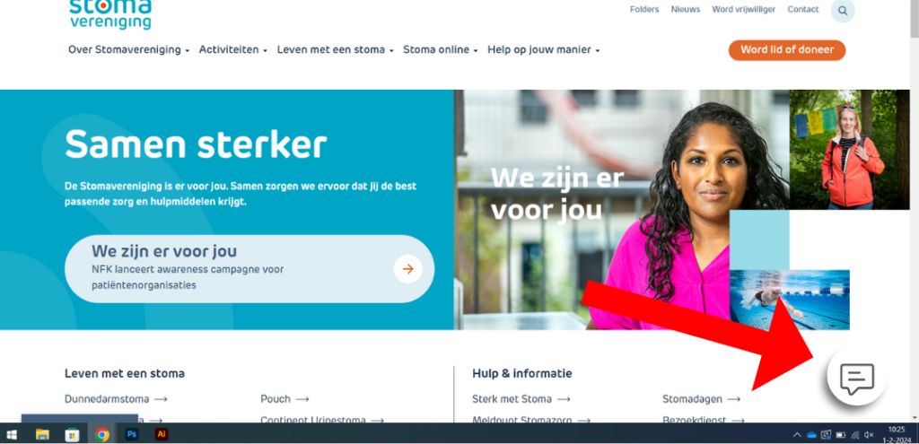 De rode pijl geeft het icoontje aan van de chatfunctie op onze website.
